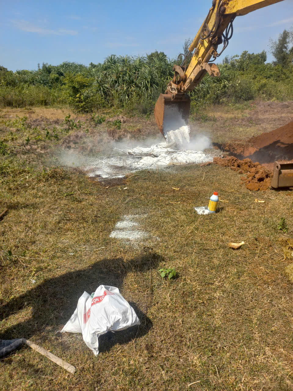 Chôn lấp và xử lý các bao tải có chứa lợn chết