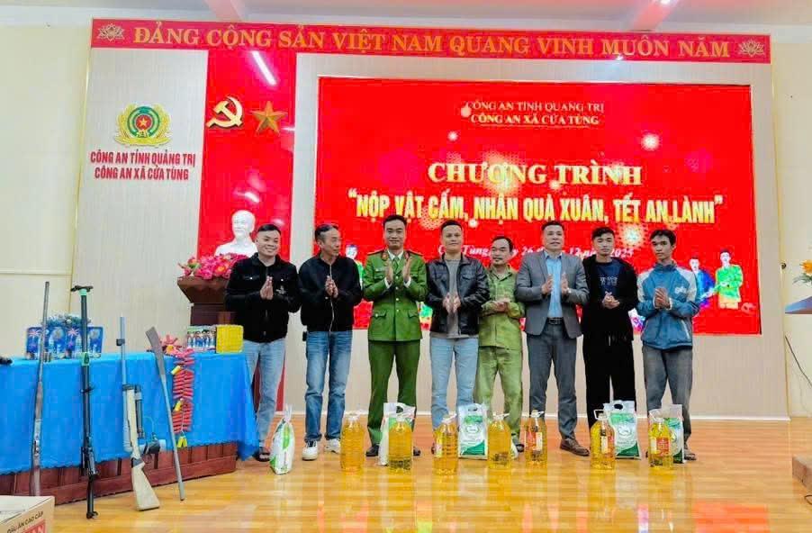 Sáng ngày 26/12/2025, Công an xã Cửa Tùng tổ chức chương trình “Nộp vật cấm, nhận quà xuân, tết an lành” nhằm tuyên truyền pháp luật về quản lý, sử dụng vũ khí, vật liệu nổ, công cụ hỗ trợ và pháo; đồng thời triển khai chương trình tuyên truyền, vận động nhân dân tự nguyện giao nộp vũ khí, vật liệu nổ, pháo các loại, hưởng ứng phong trào “Toàn dân bảo vệ an ninh Tổ quốc”, góp phần bảo đảm an ninh trật tự trước, trong và sau Tết Nguyên đán.