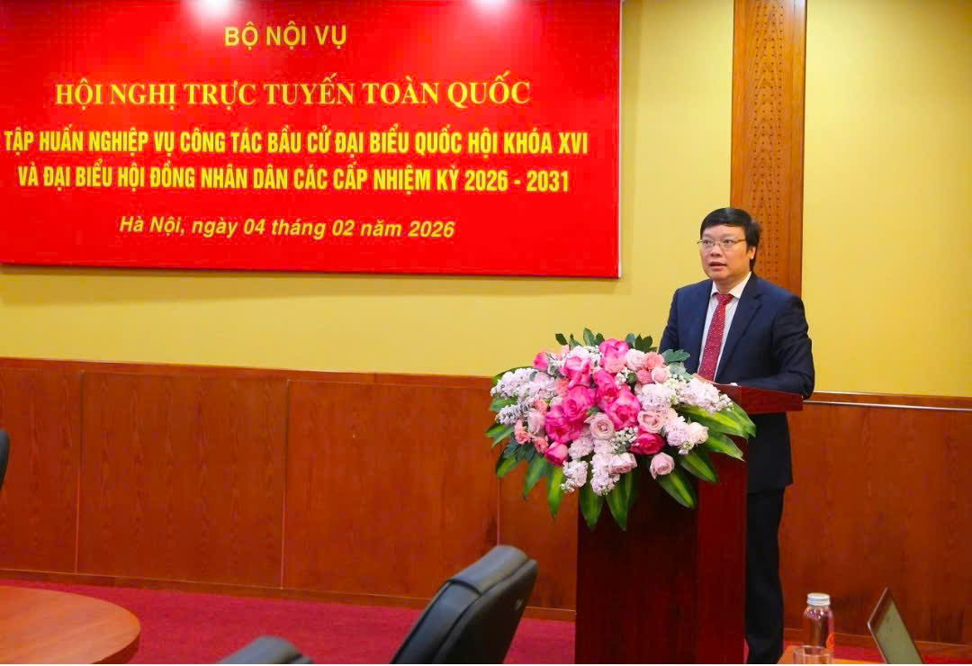 Sáng ngày 04/02/2026, Bộ Nội vụ đã chủ trì tổ chức Hội nghị trực tuyến toàn quốc tập huấn nghiệp vụ công tác bầu cử đại biểu Quốc hội khóa XVI và đại biểu Hội đồng nhân dân các cấp, nhiệm kỳ 2026 – 2031. Hội nghị được kết nối từ điểm cầu Trung ương tại trụ sở Bộ Nội vụ đến các điểm cầu tại địa phương trên cả nước.