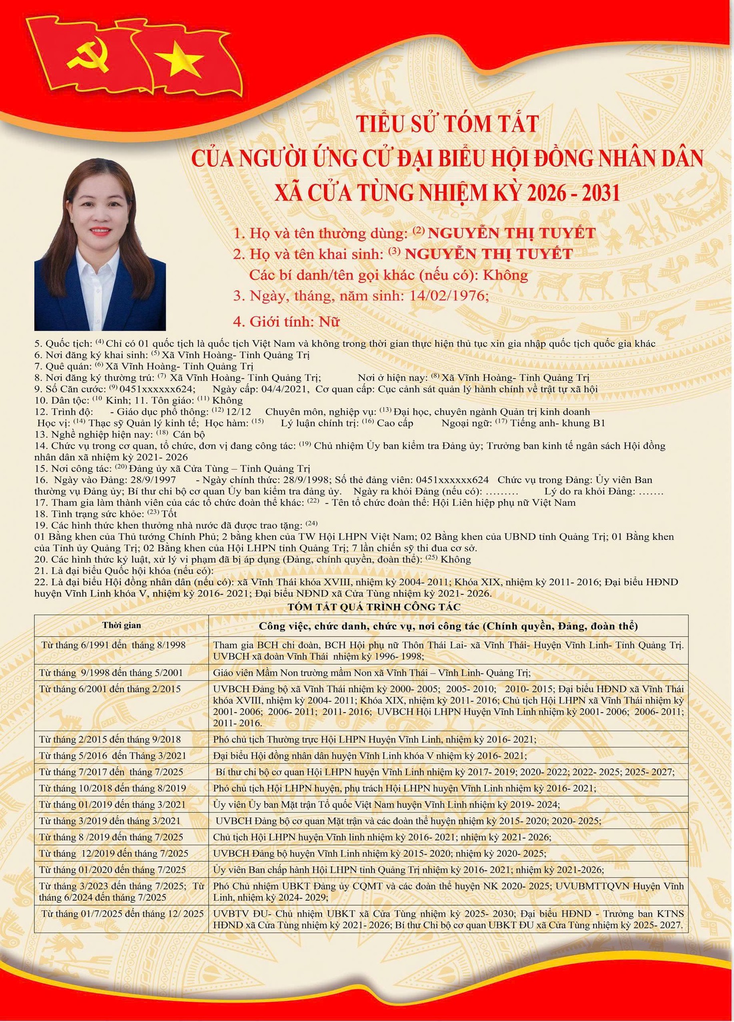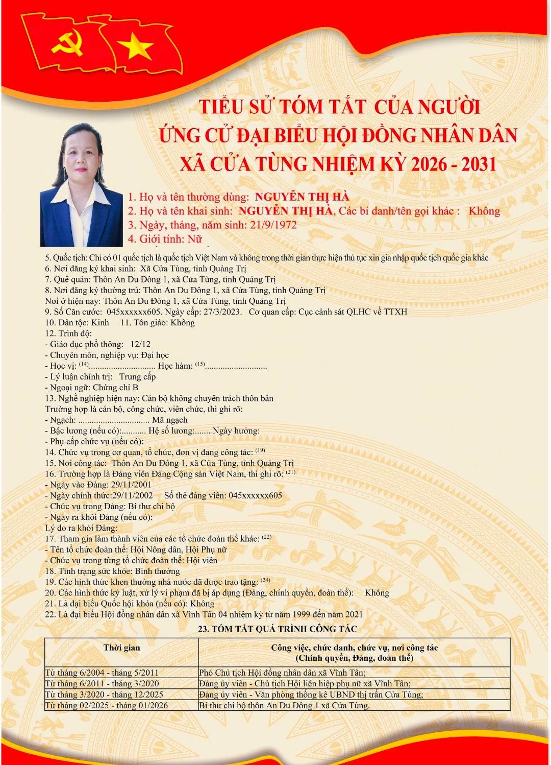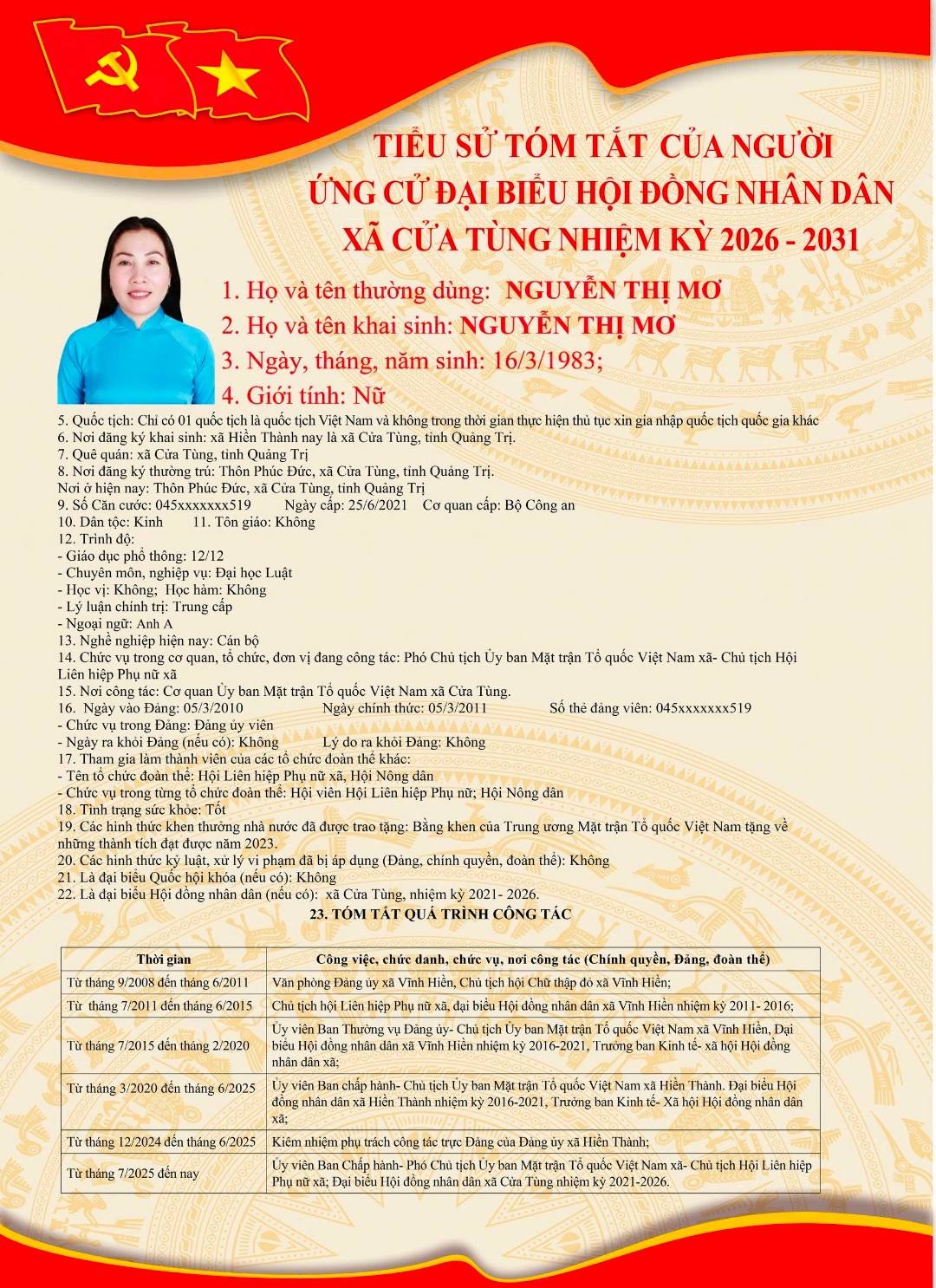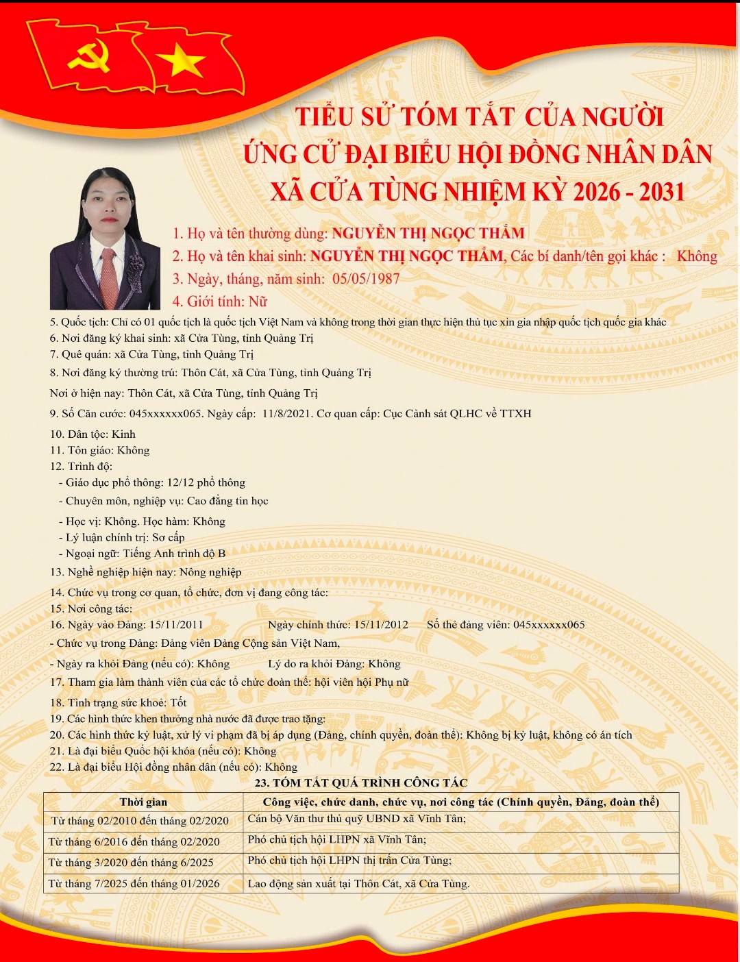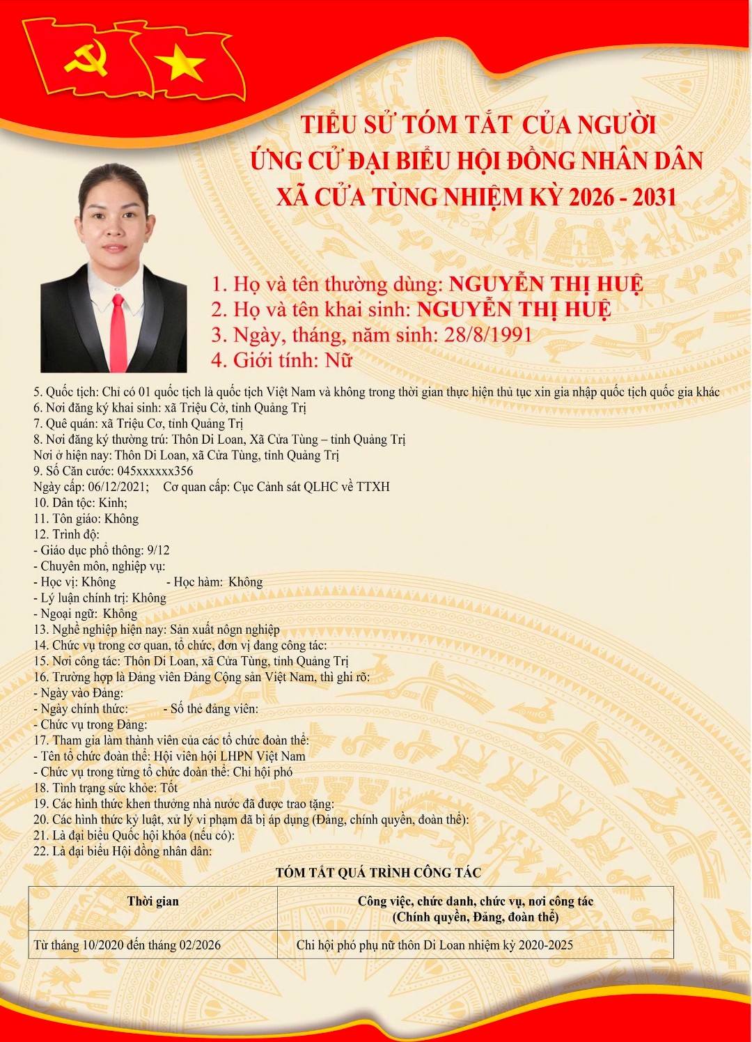 Tiểu sử tóm tắt của những người ứng cử đại biểu HĐND xã Cửa Tùng khóa II, nhiệm kỳ 2026-2031