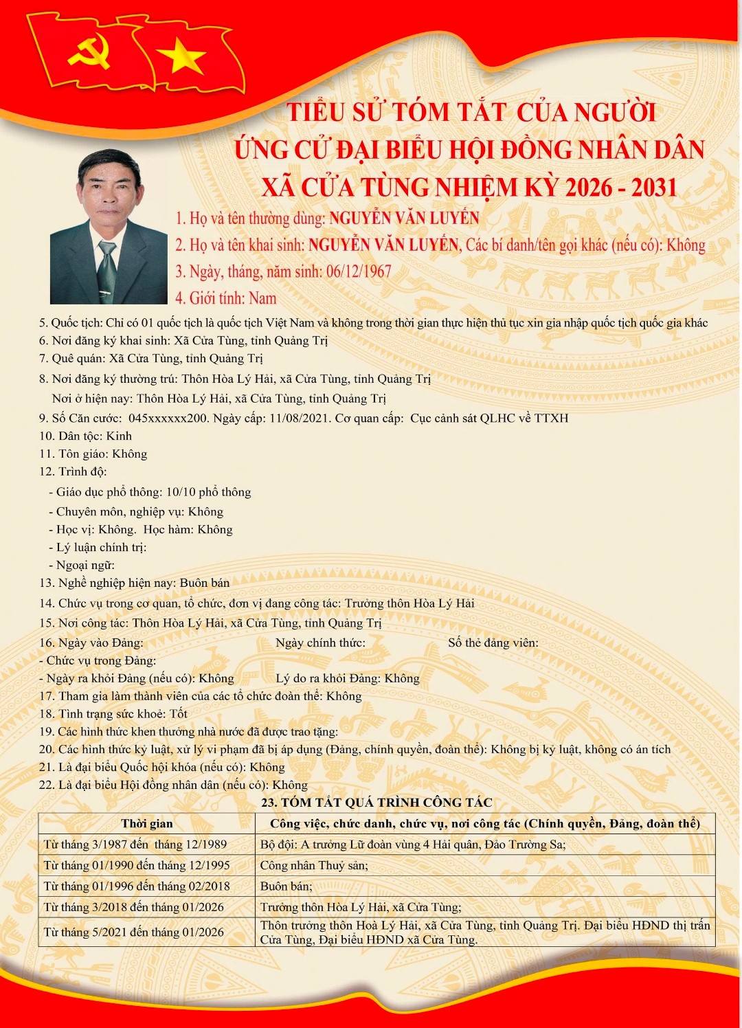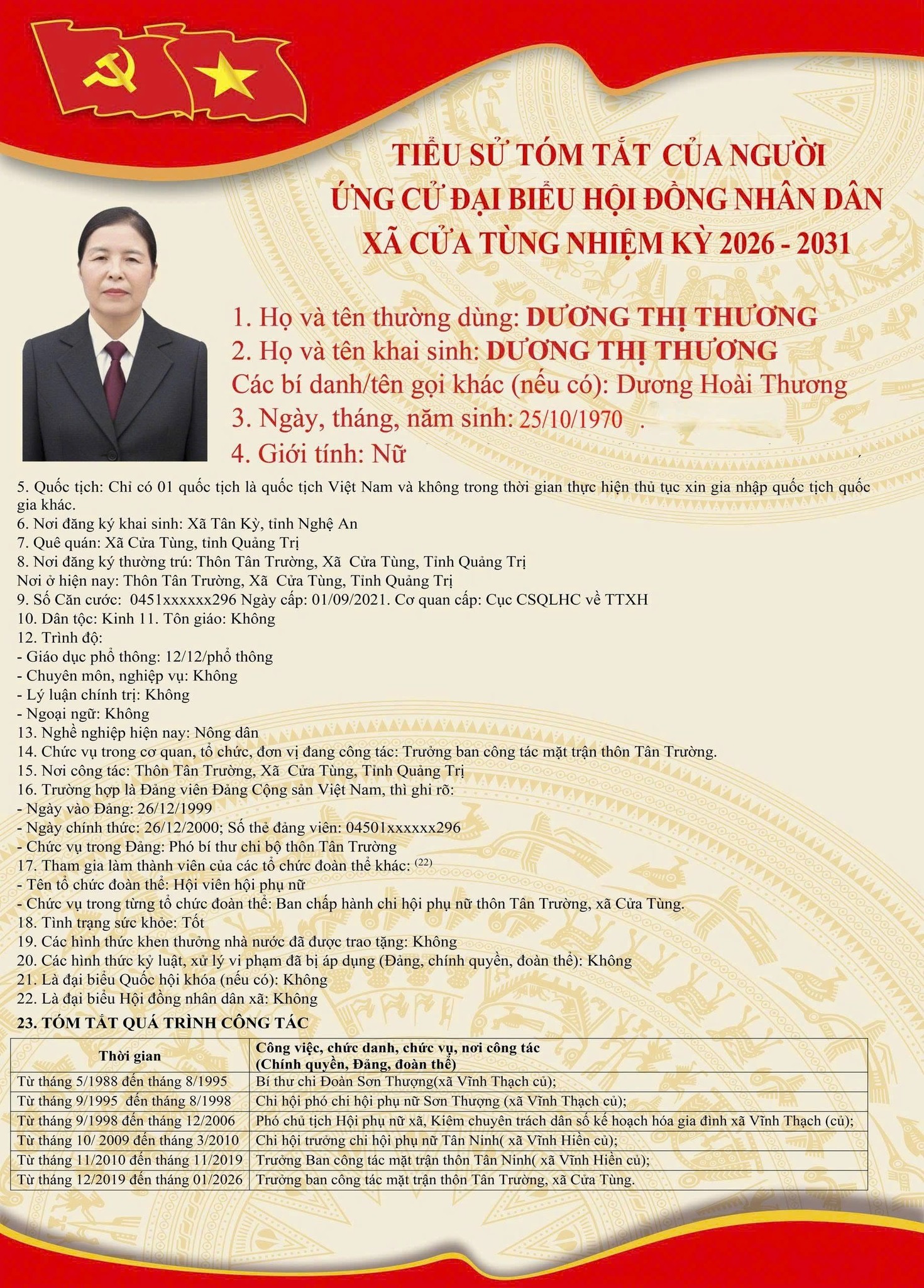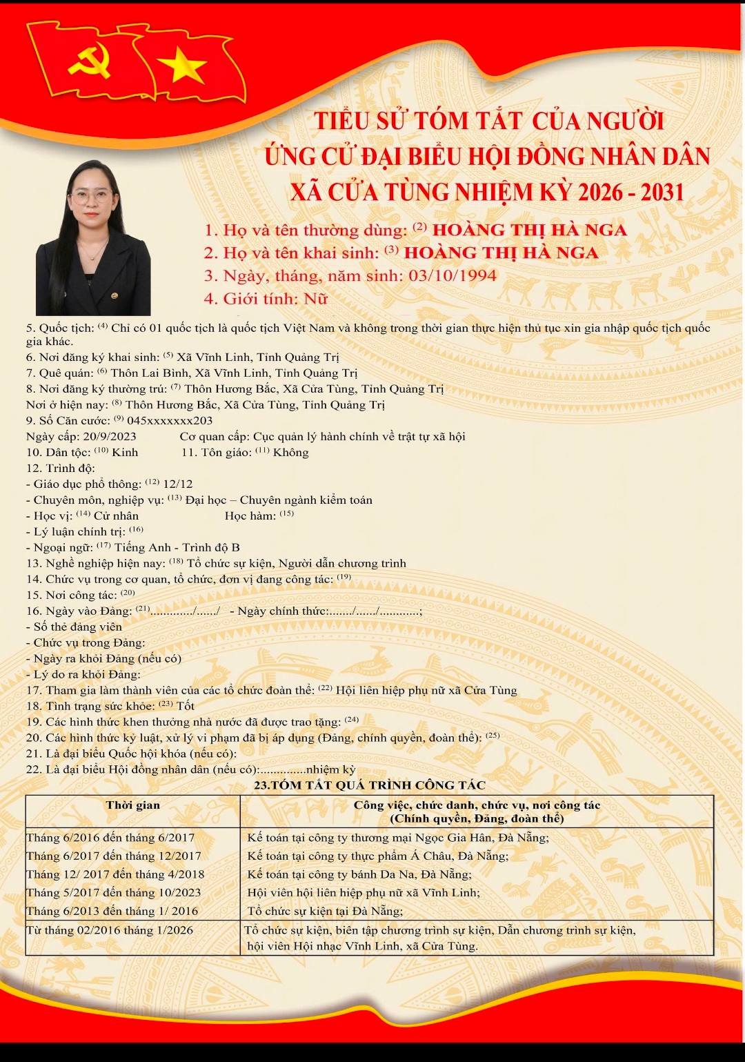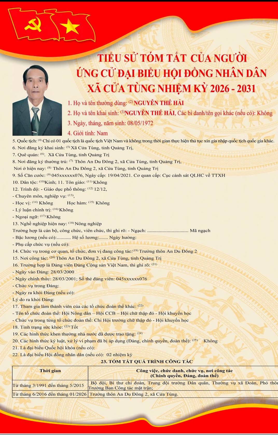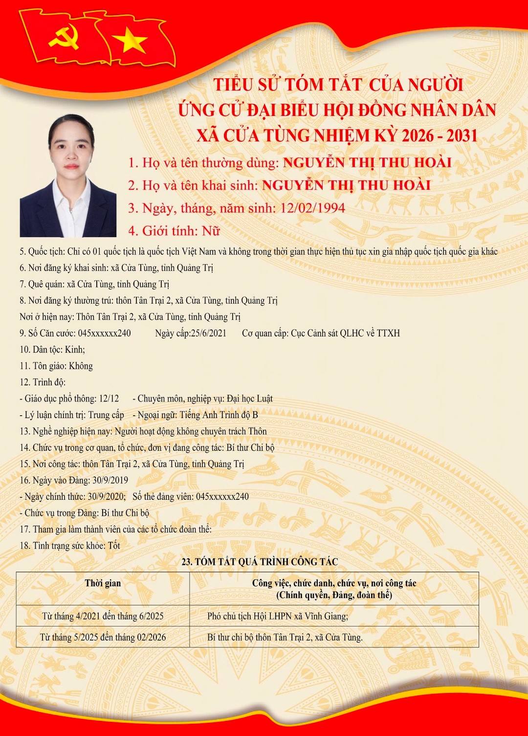 Tiểu sử tóm tắt của những người ứng cử đại biểu HĐND xã Cửa Tùng khóa II, nhiệm kỳ 2026-2031