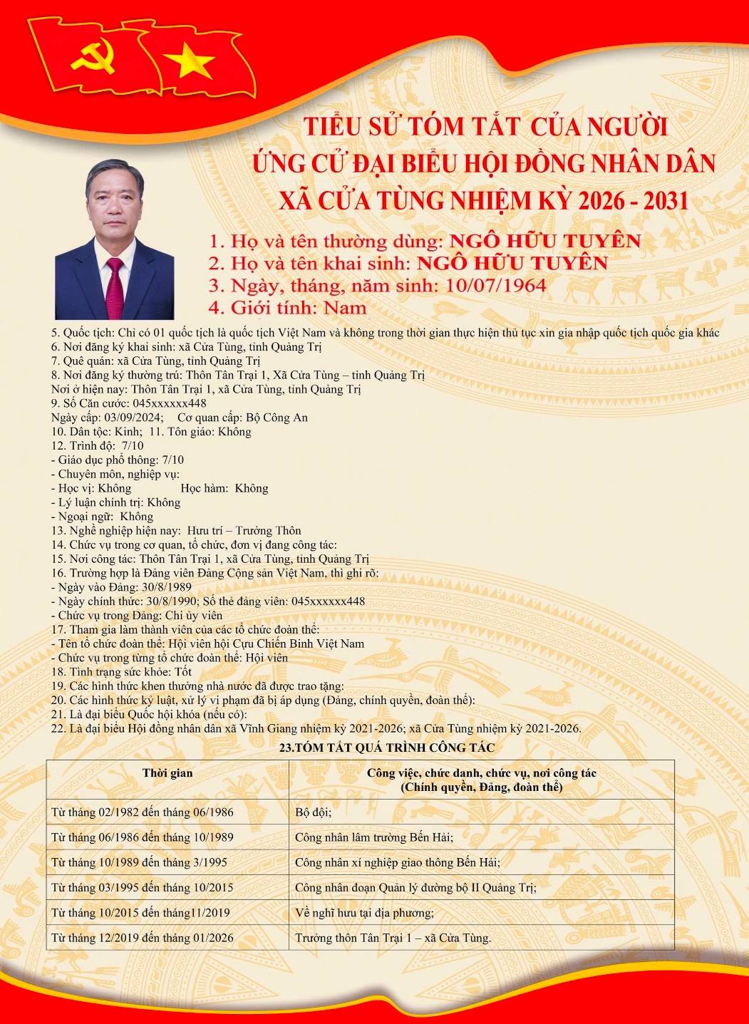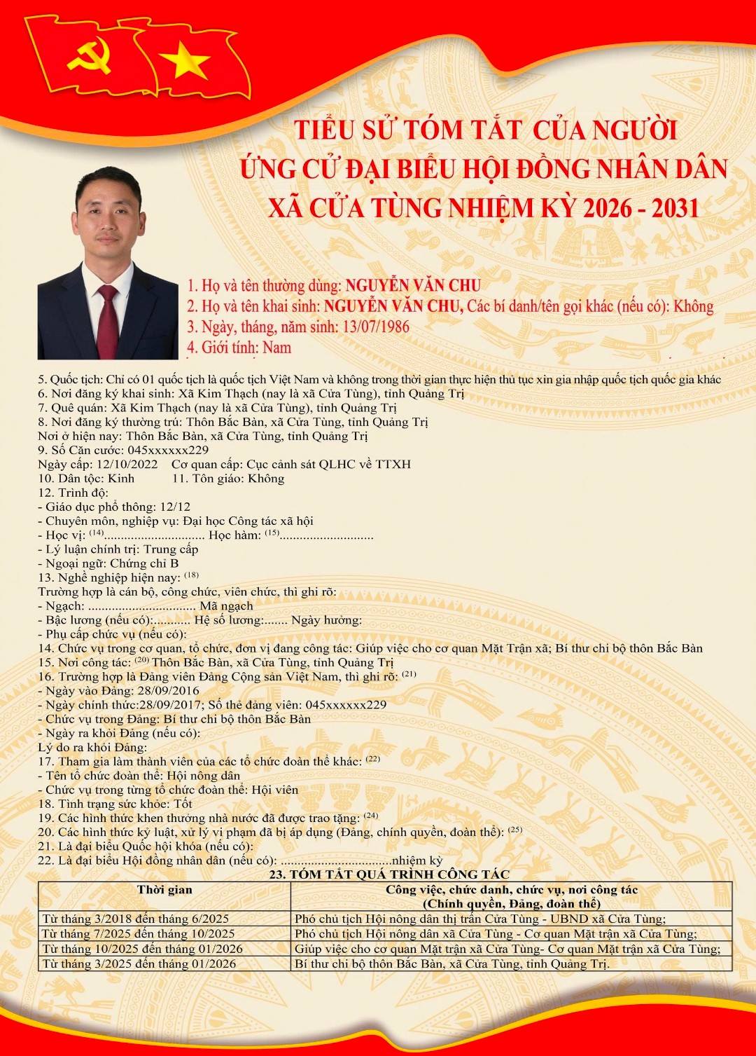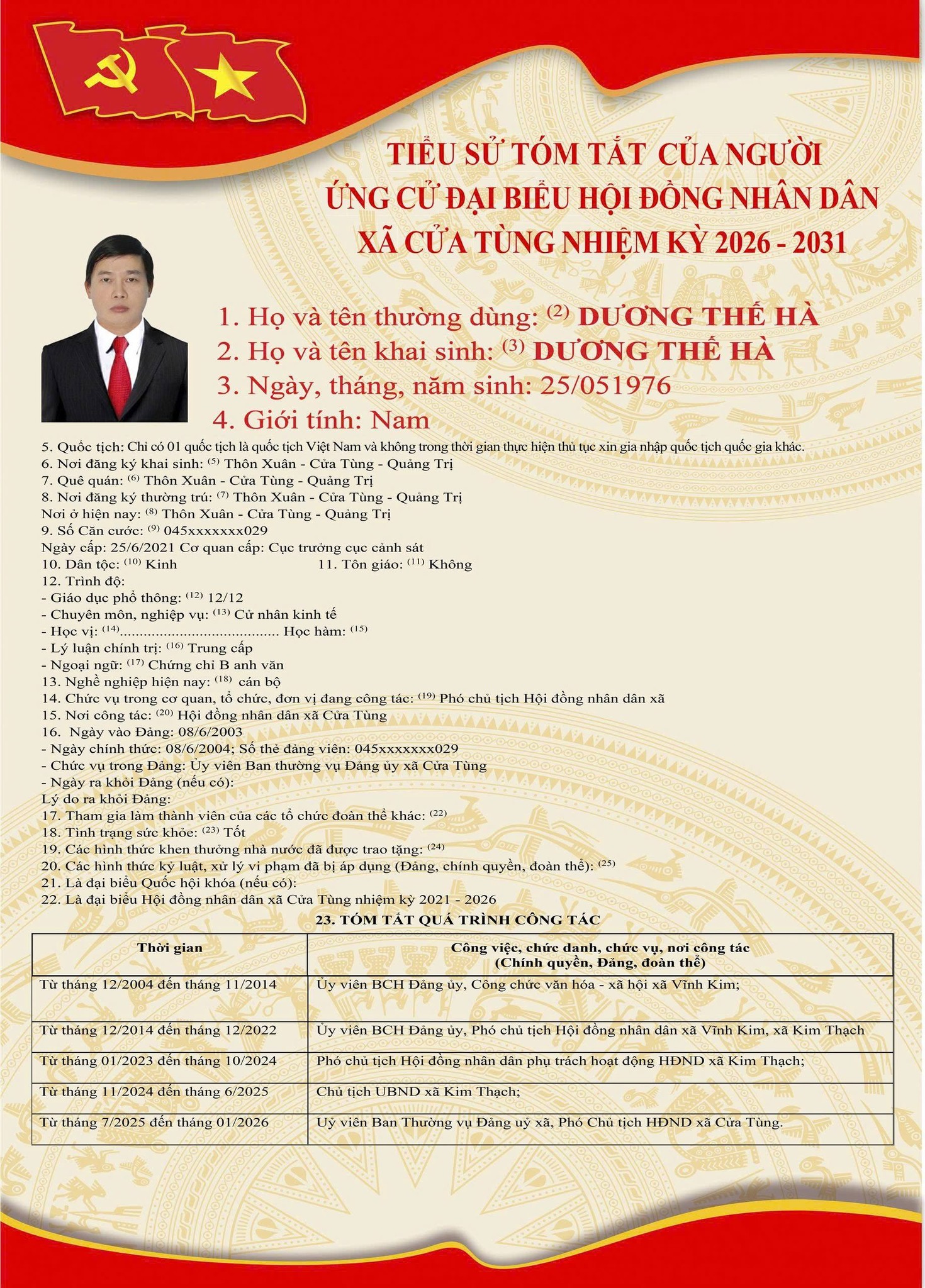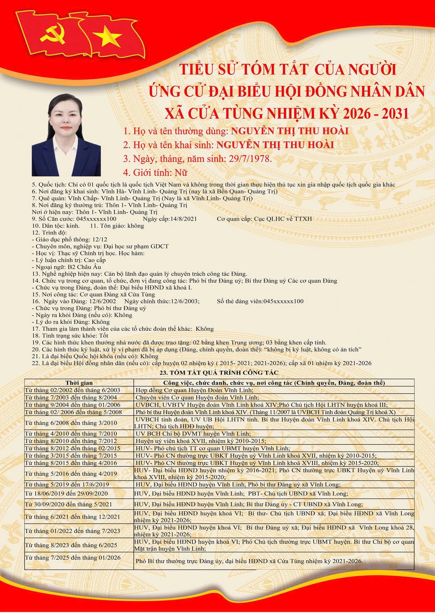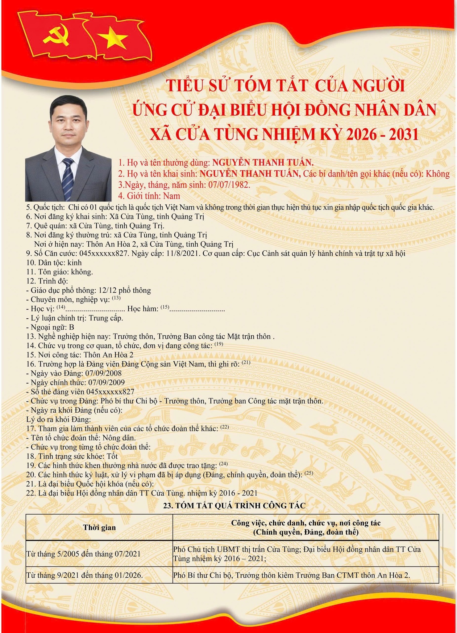 Tiểu sử tóm tắt của những người ứng cử đại biểu HĐND xã Cửa Tùng khóa II, nhiệm kỳ 2026-2031