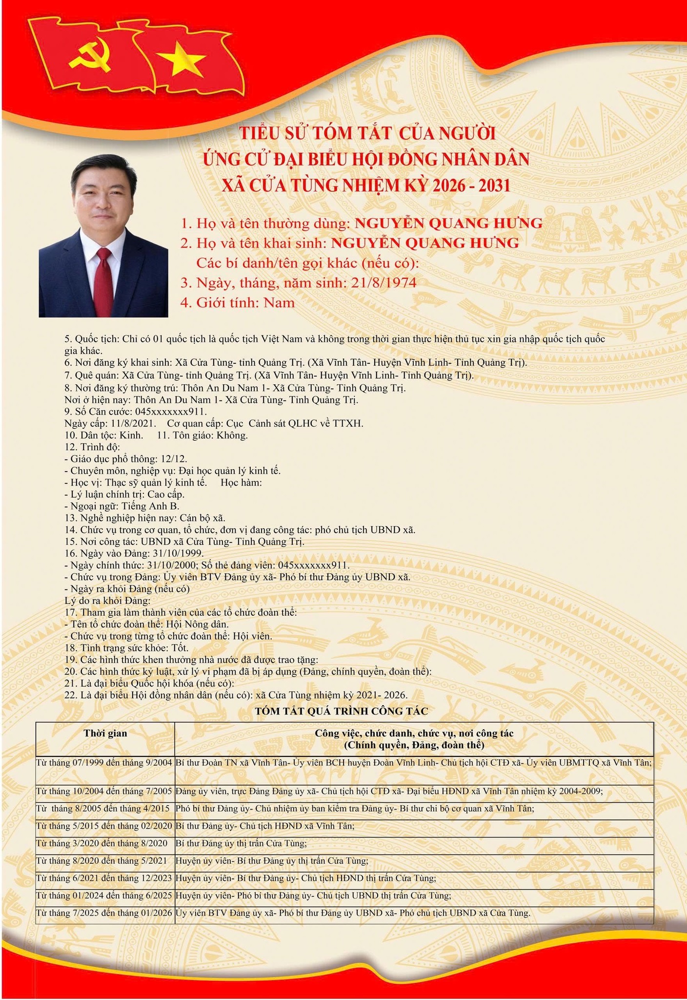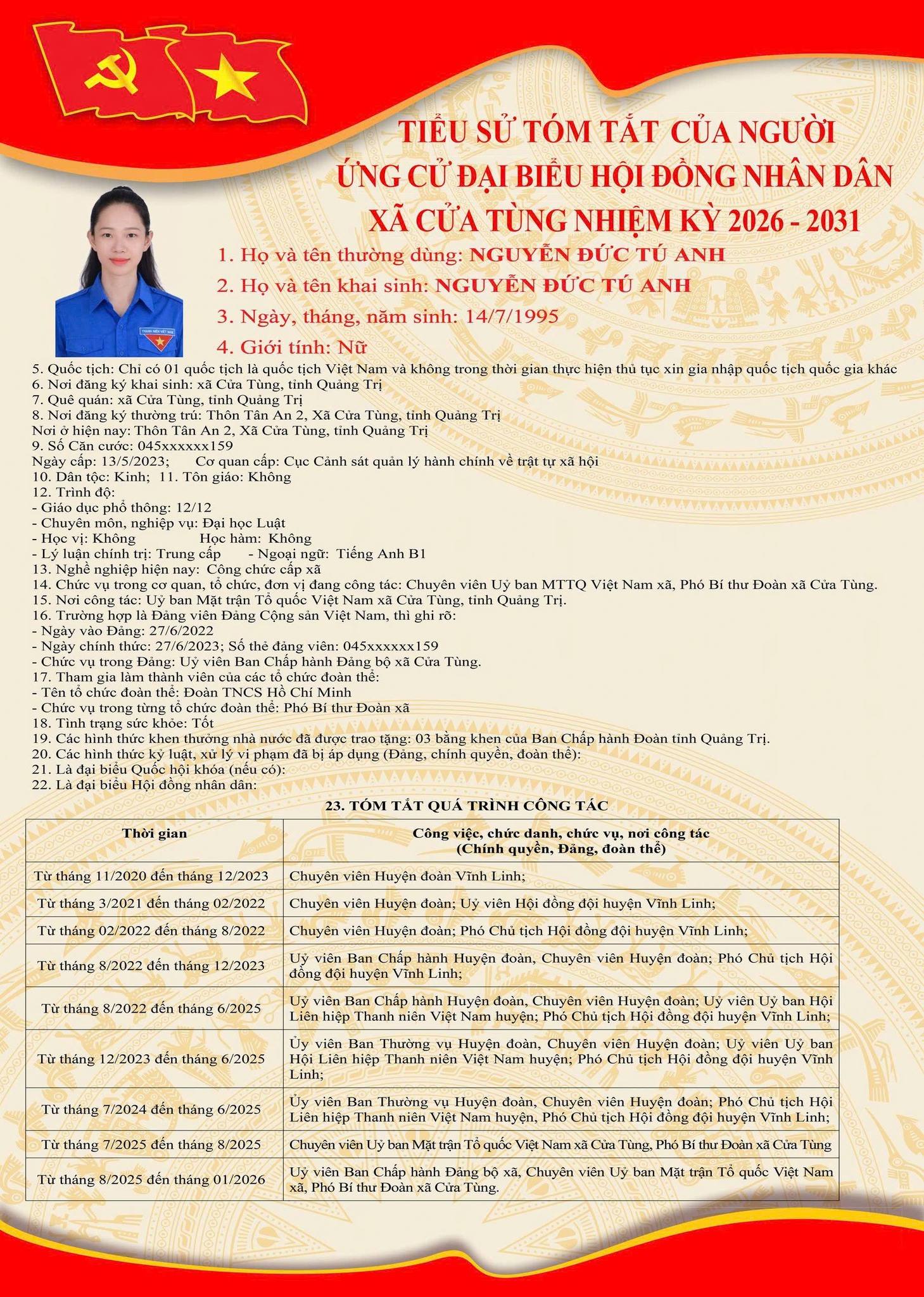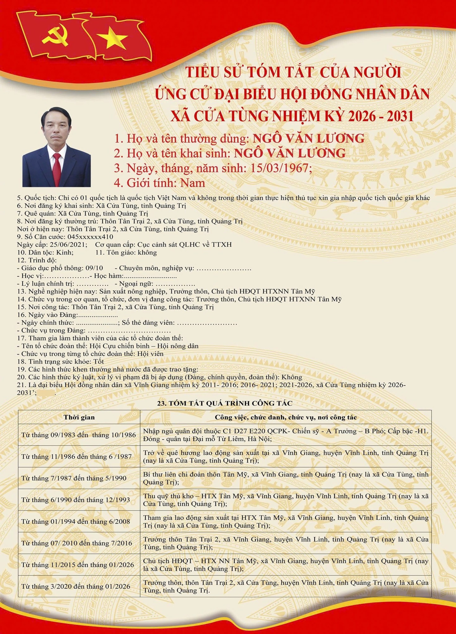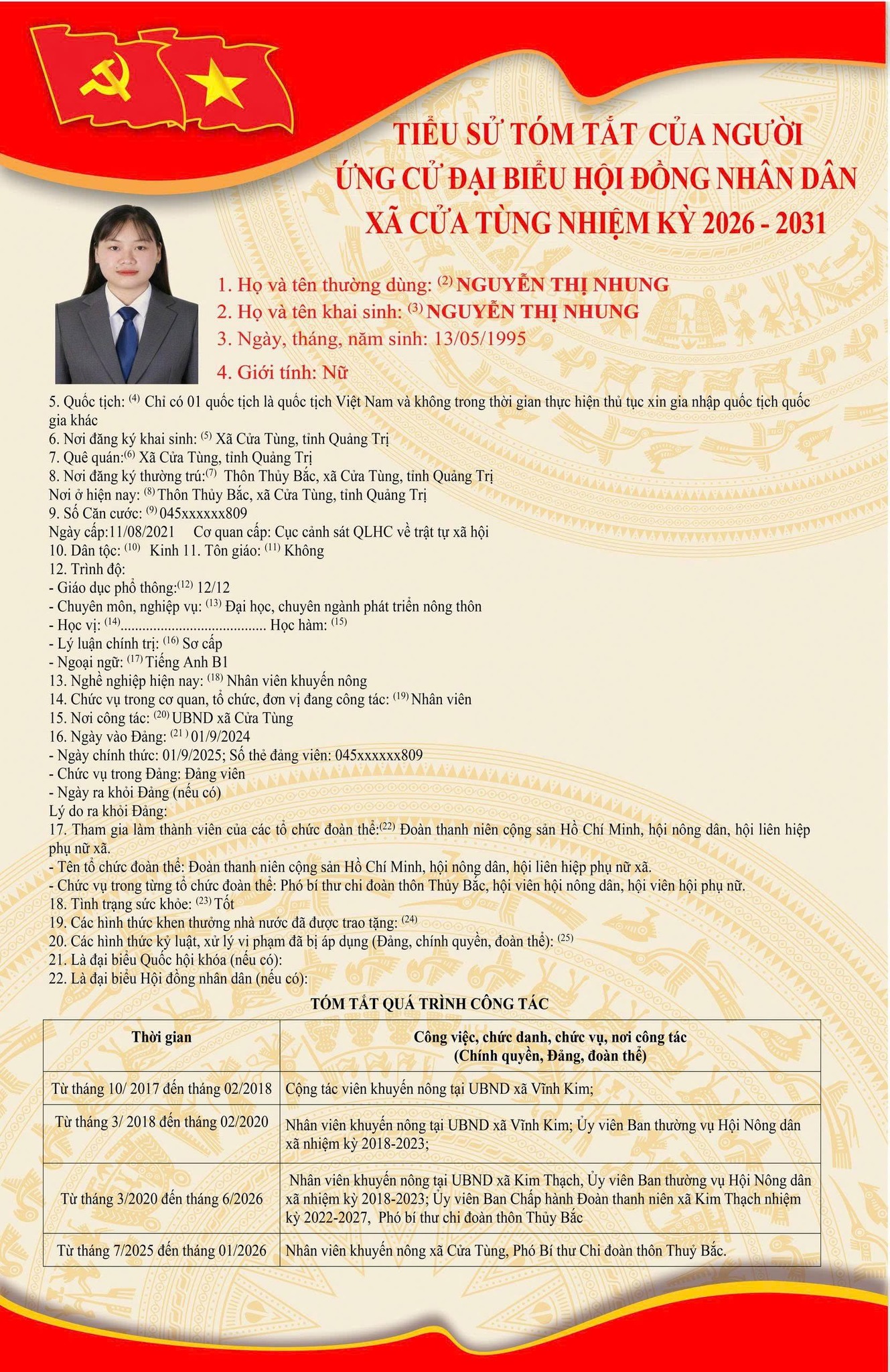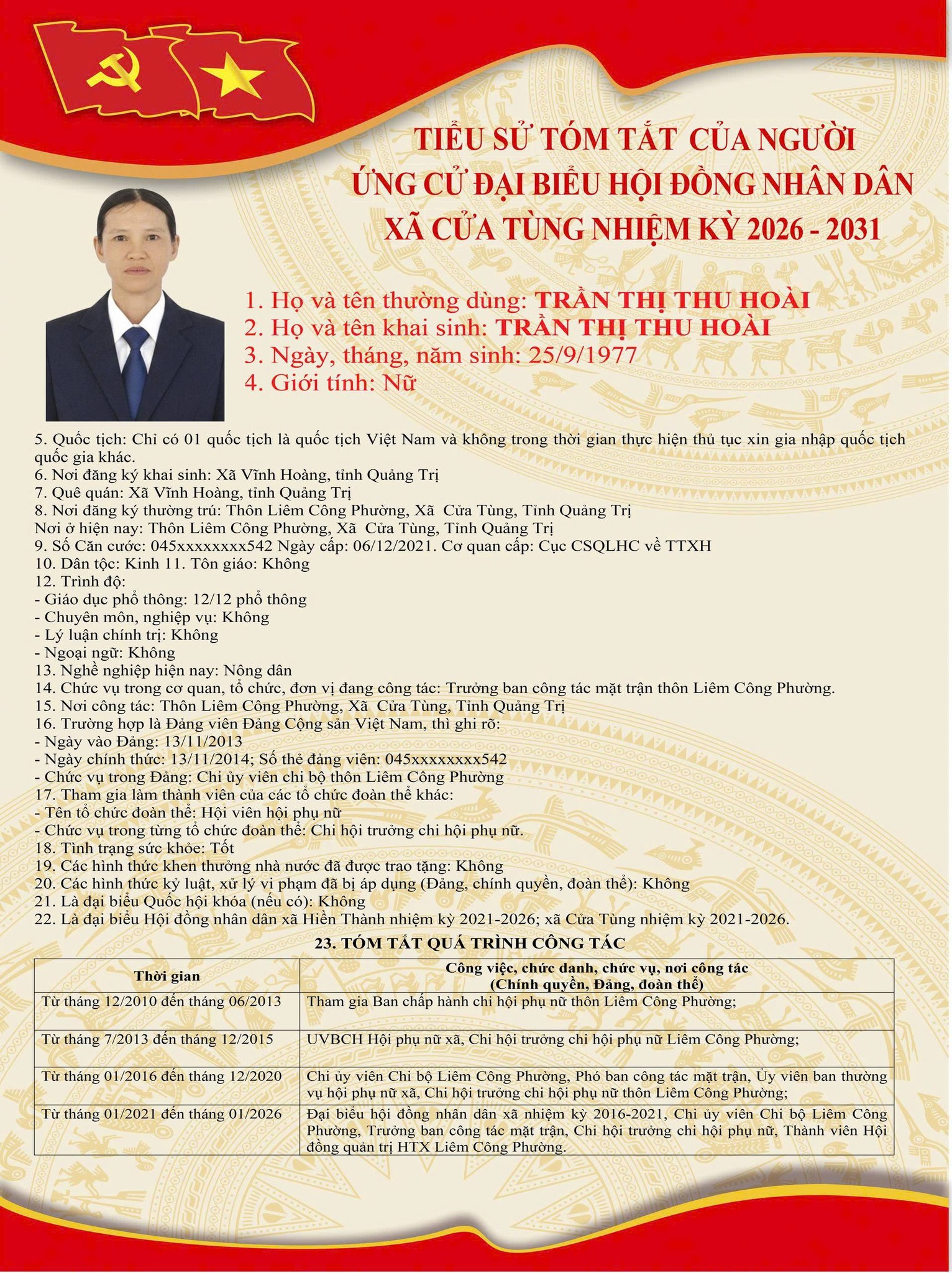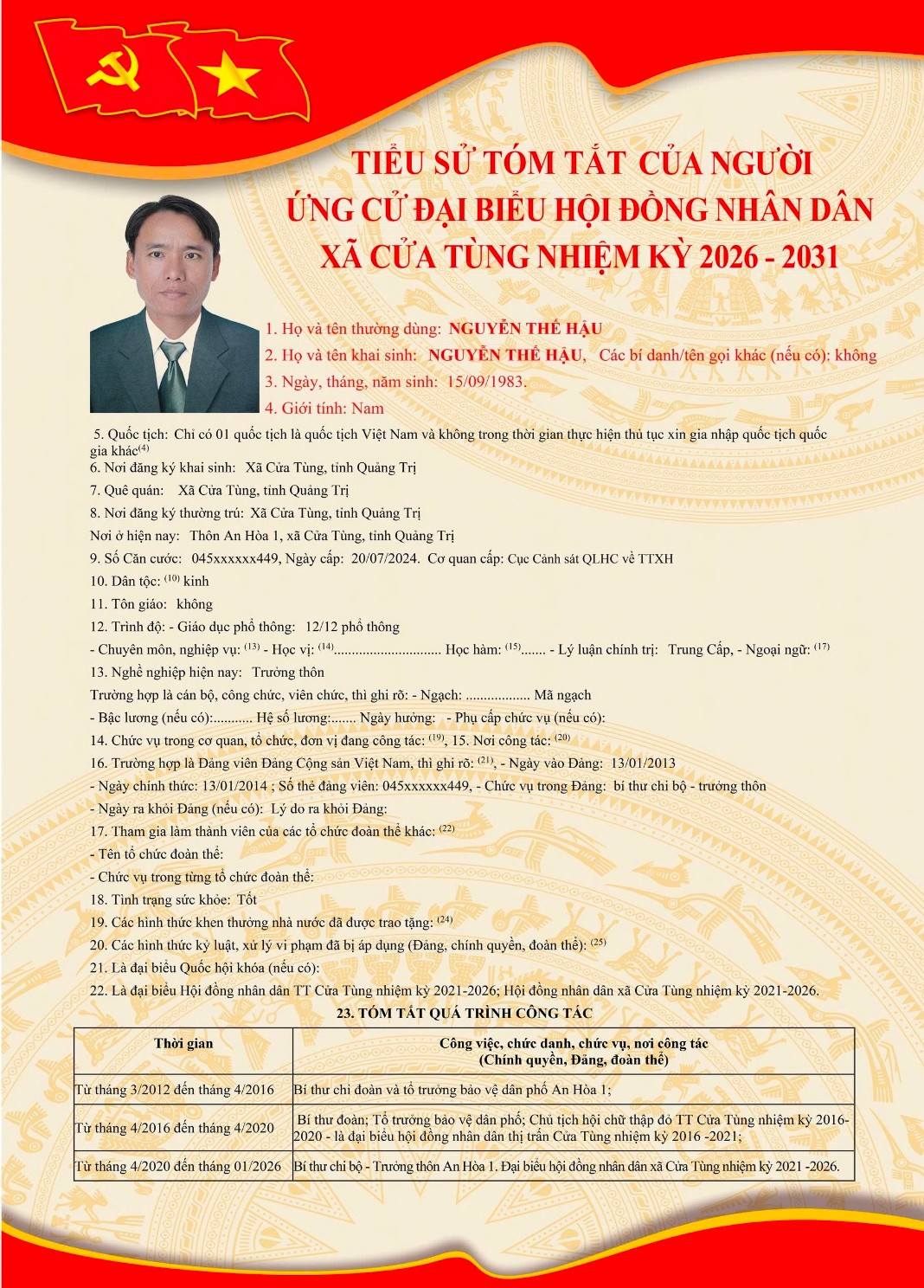 Tiểu sử tóm tắt của những người ứng cử đại biểu HĐND xã Cửa Tùng khóa II, nhiệm kỳ 2026-2031