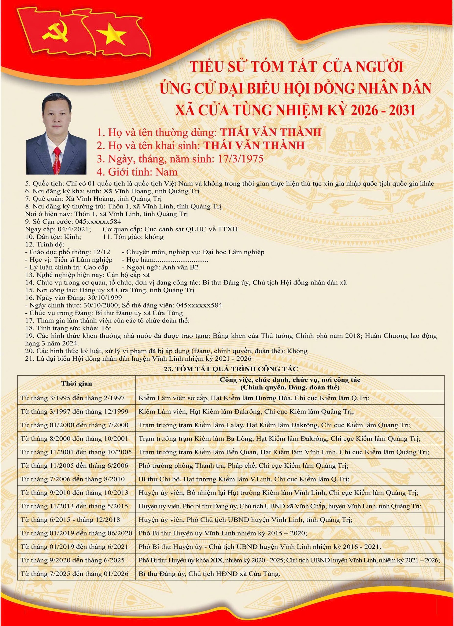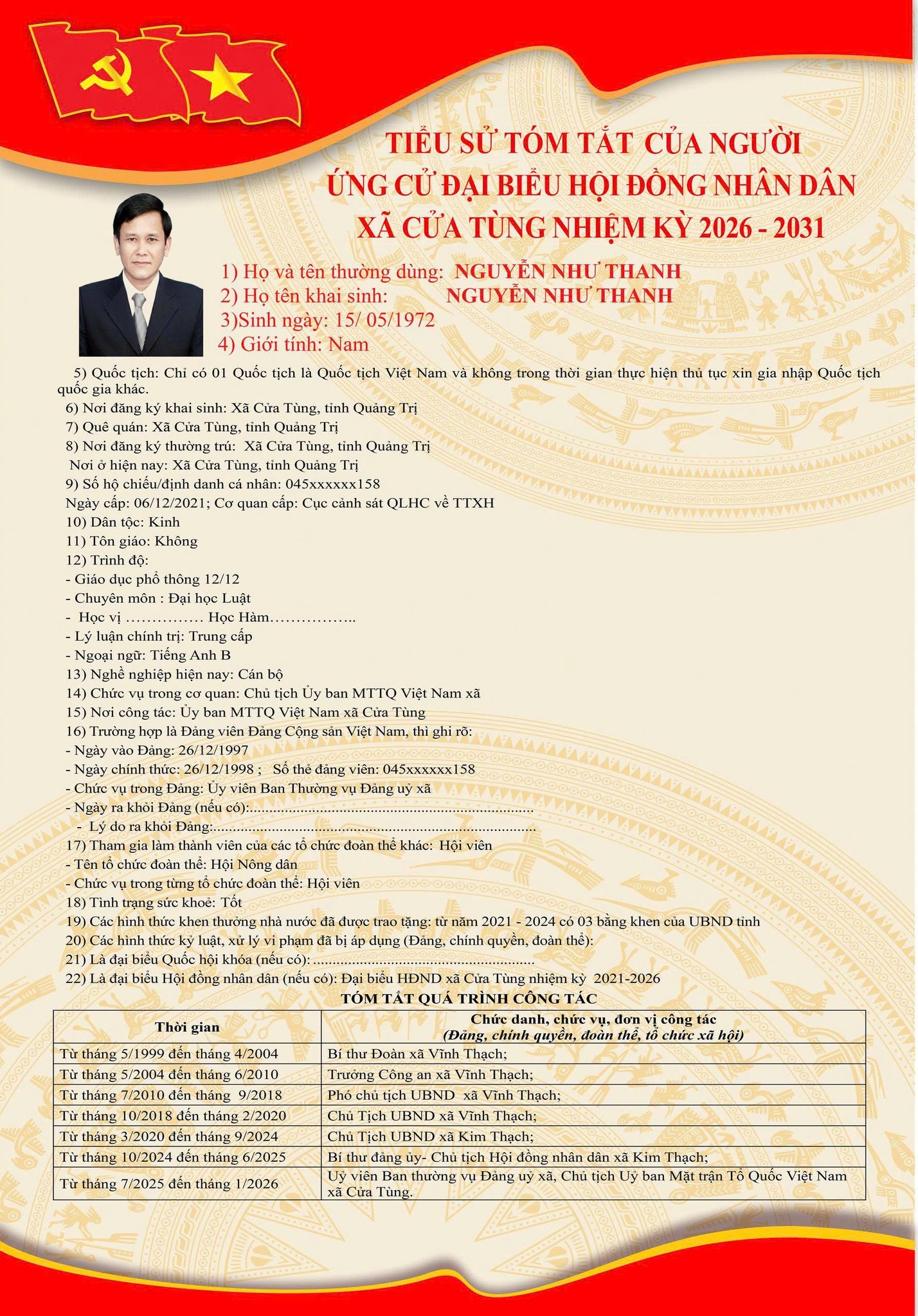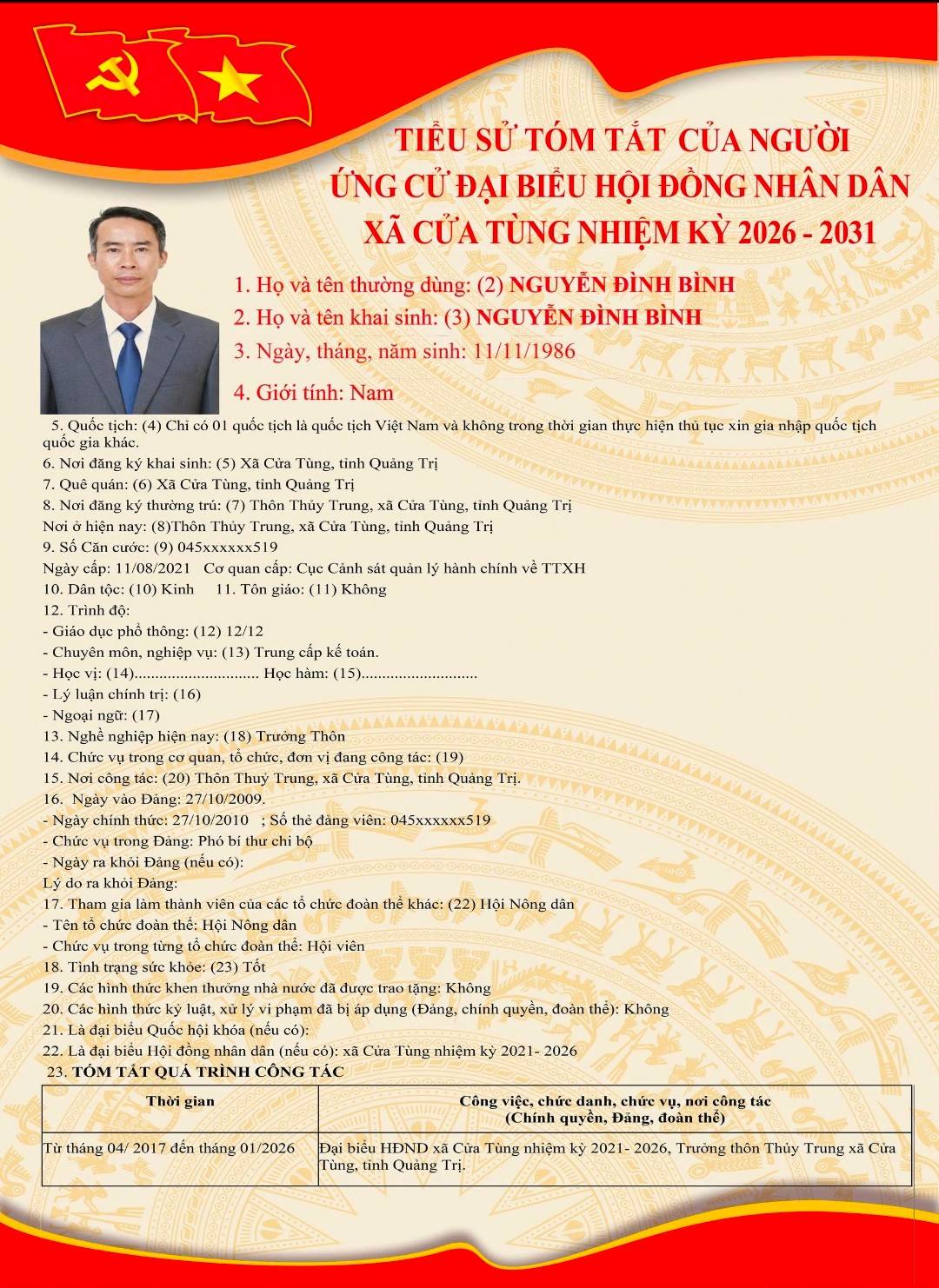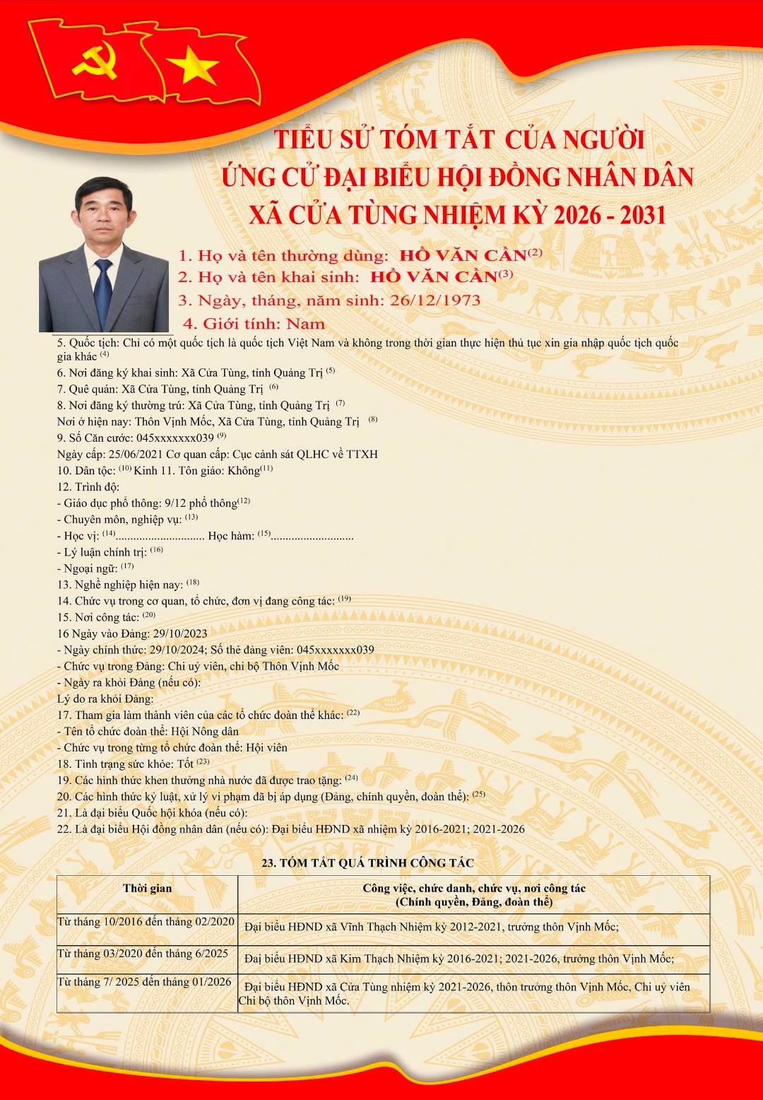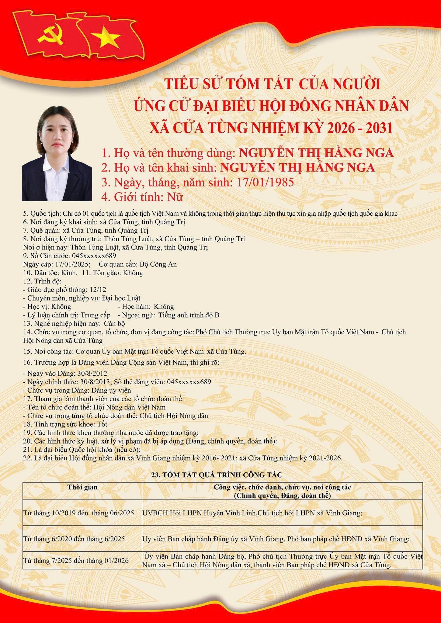 Tiểu sử tóm tắt của những người ứng cử đại biểu HĐND xã Cửa Tùng khóa II, nhiệm kỳ 2026-2031