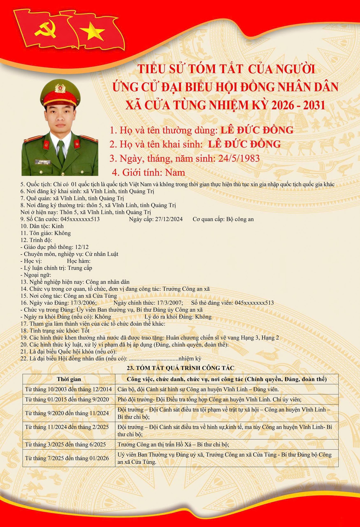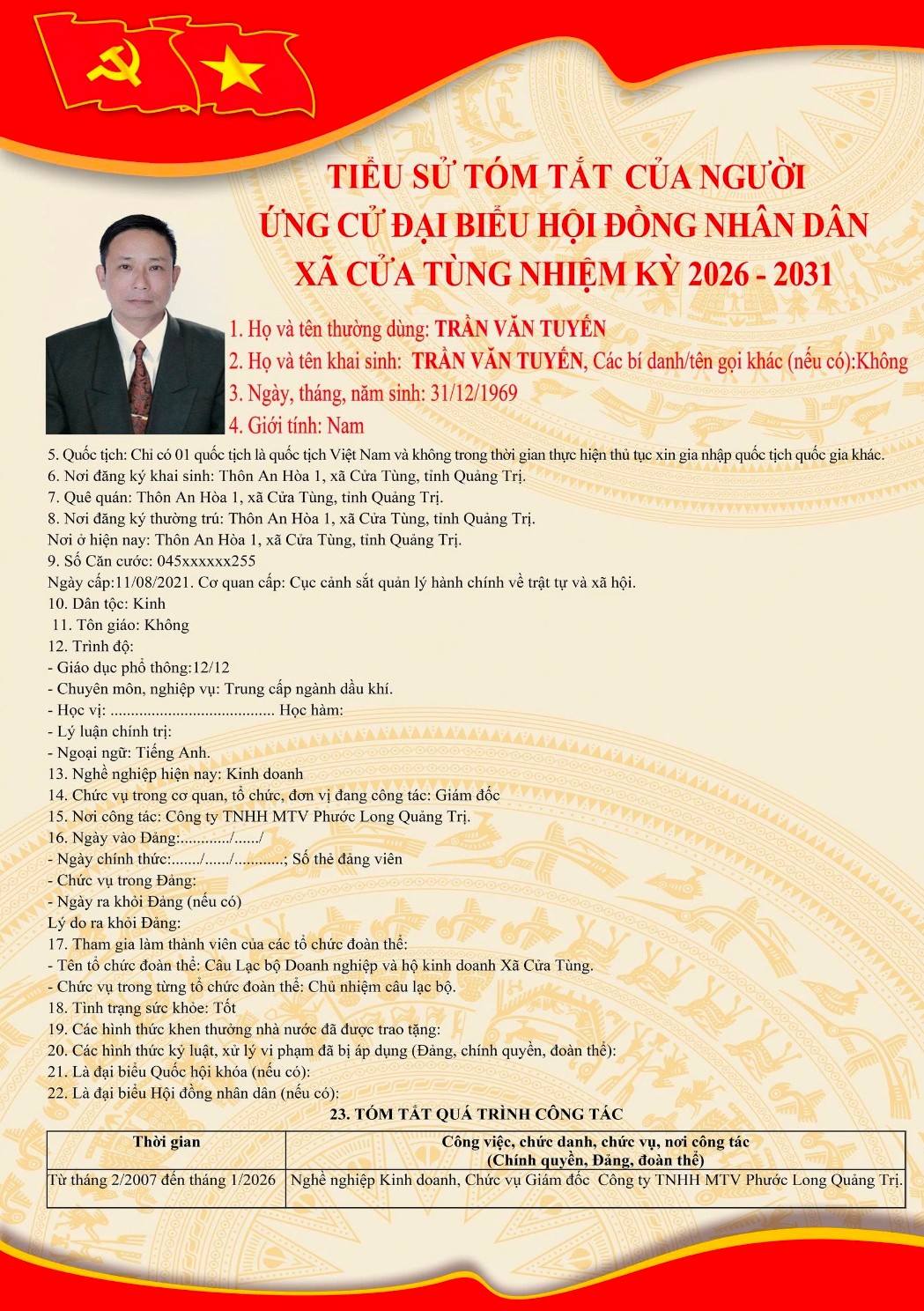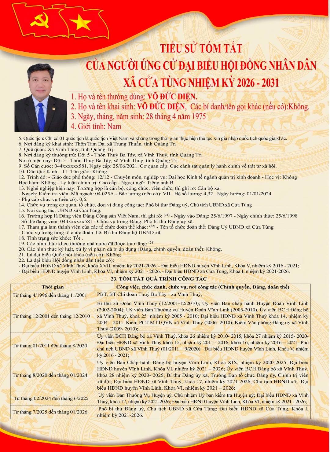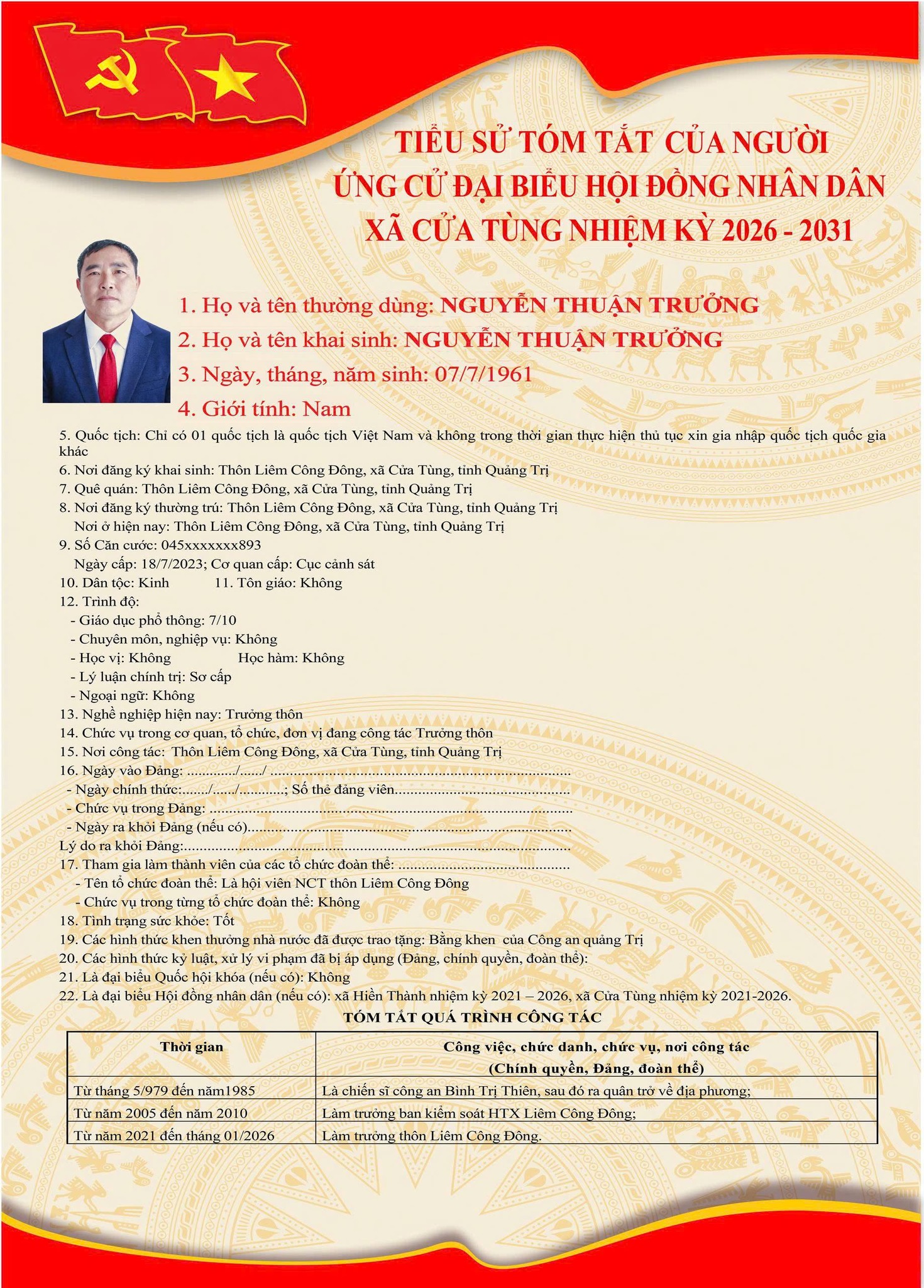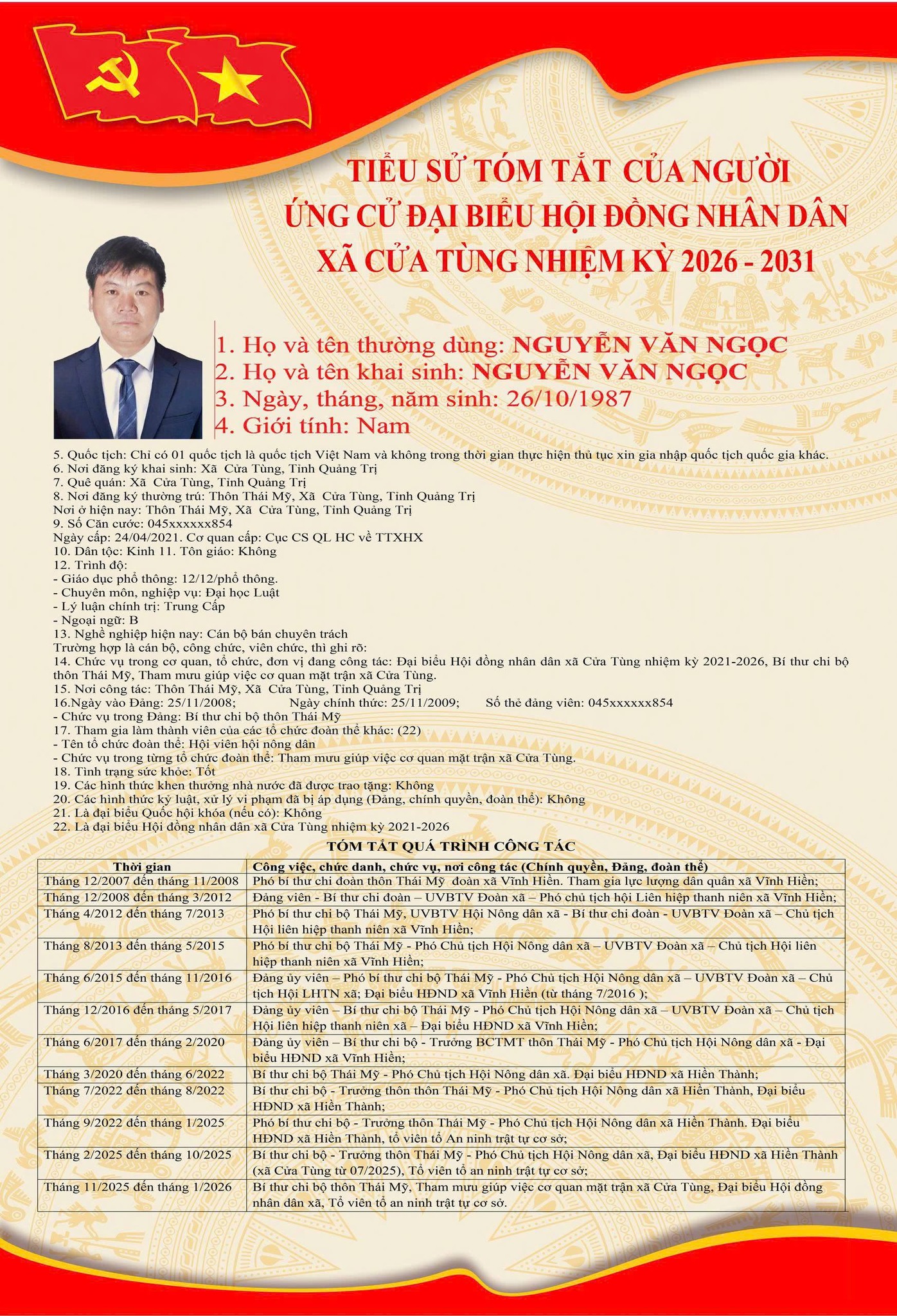 Tiểu sử tóm tắt của những người ứng cử đại biểu HĐND xã Cửa Tùng khóa II, nhiệm kỳ 2026-2031