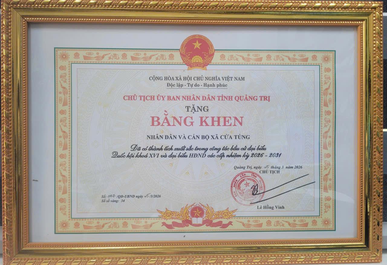 Nhân dân và cán bộ xã Cửa Tùng vừa vinh dự được Chủ tịch UBND tỉnh Quảng Trị tặng Bằng khen vì đã có thành tích xuất sắc trong công tác bầu cử đại biểu Quốc hội khóa XVI và đại biểu HĐND các cấp nhiệm kỳ 2026 – 2031.