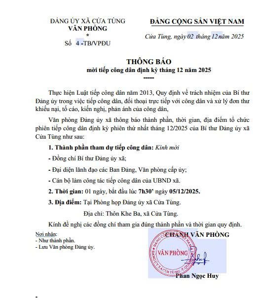 THÔNG BÁO tiếp công dân định kỳ phiên tháng 10/2025 của Đảng ủy xã Cửa Tùng