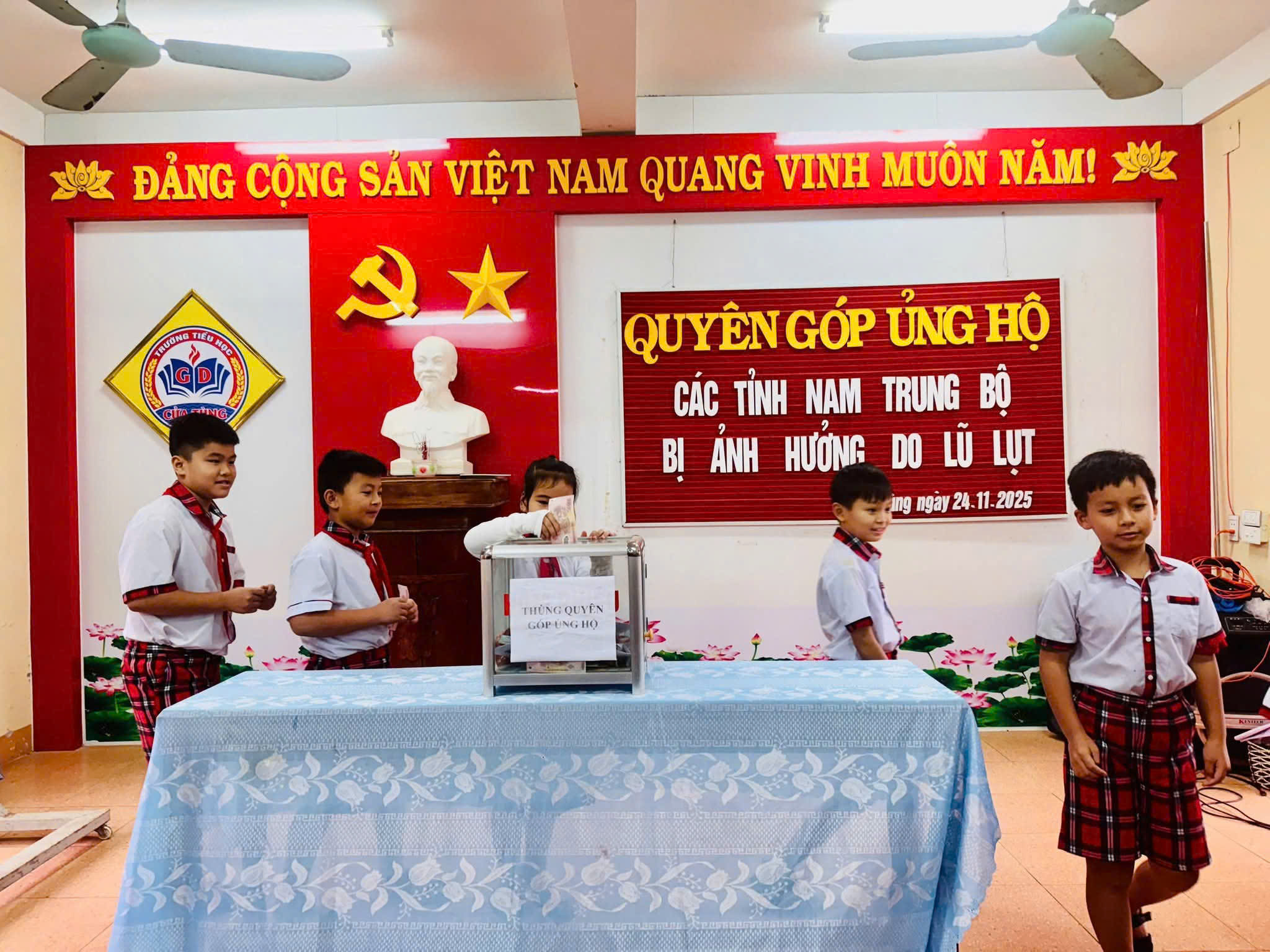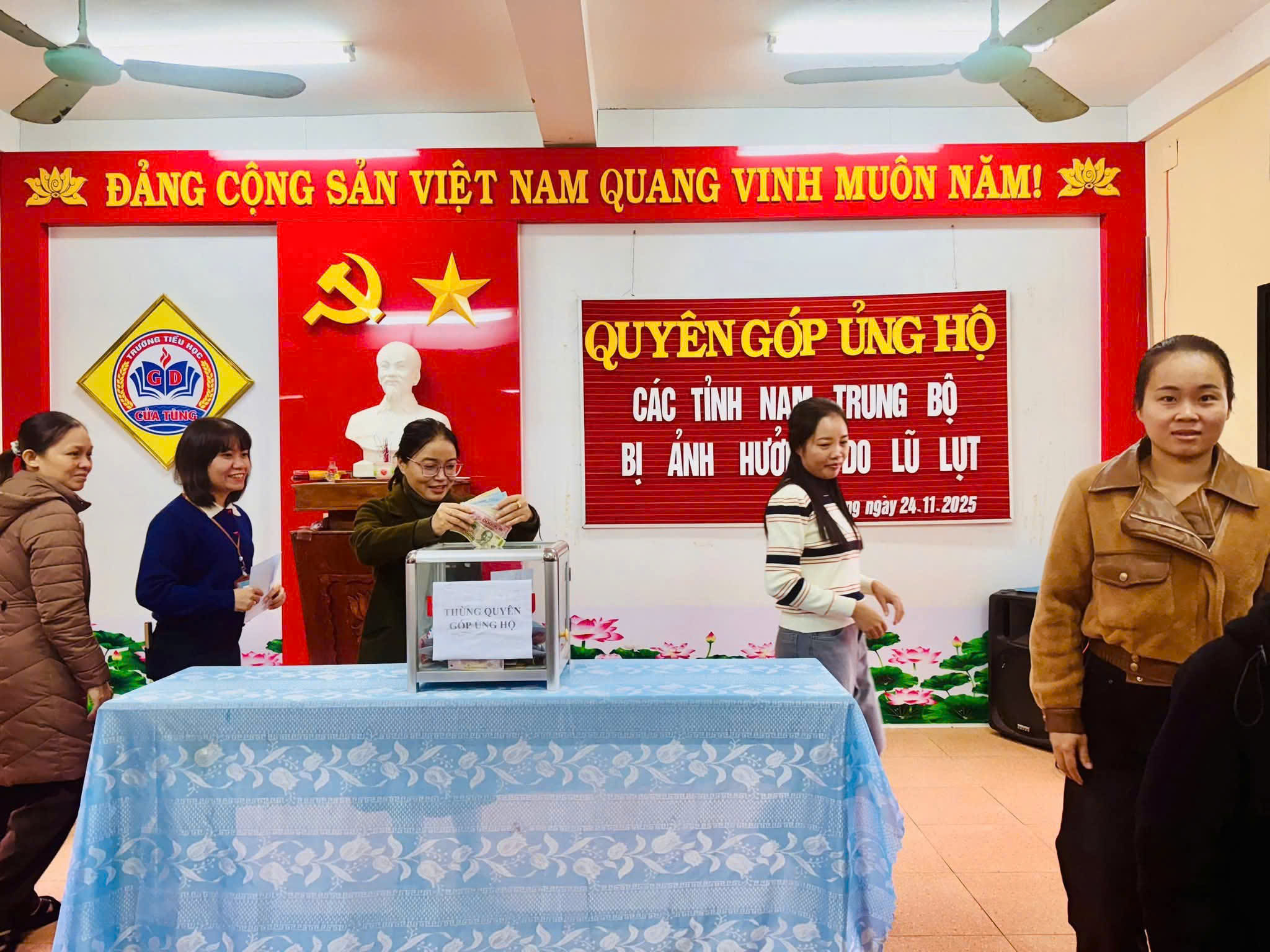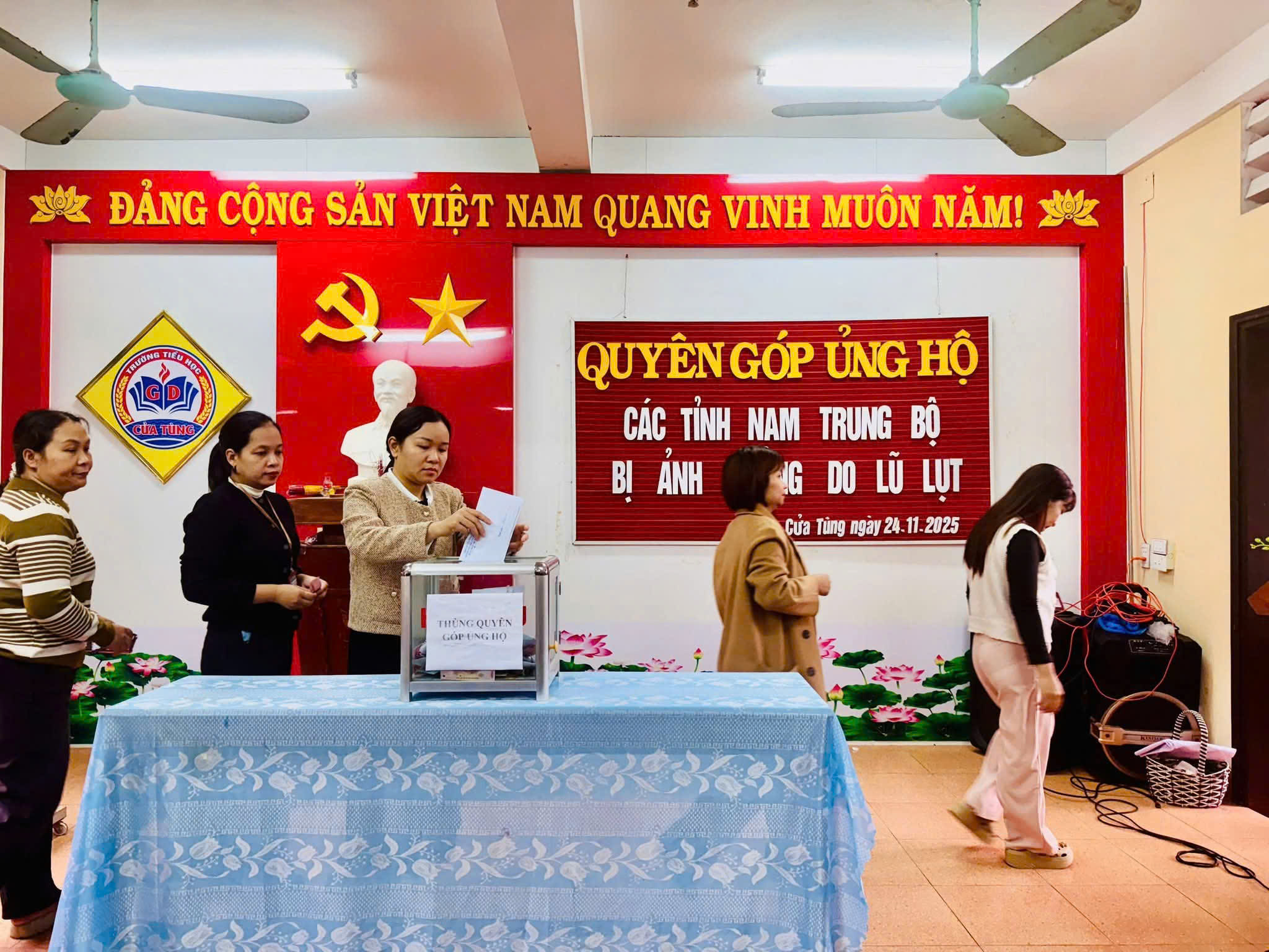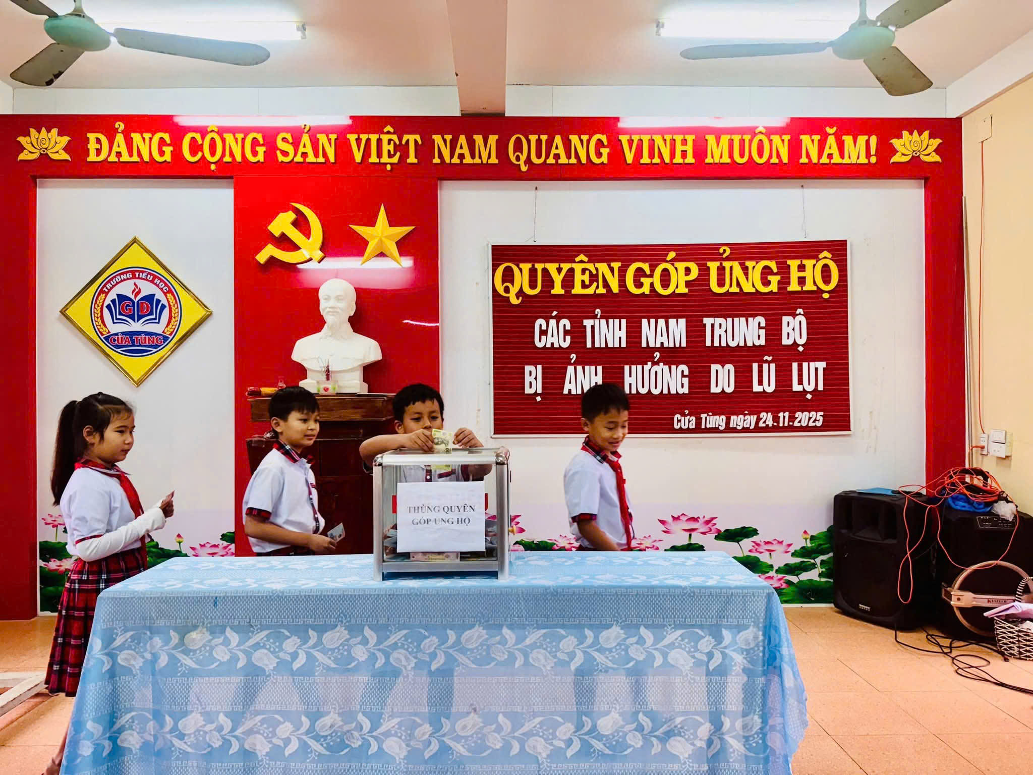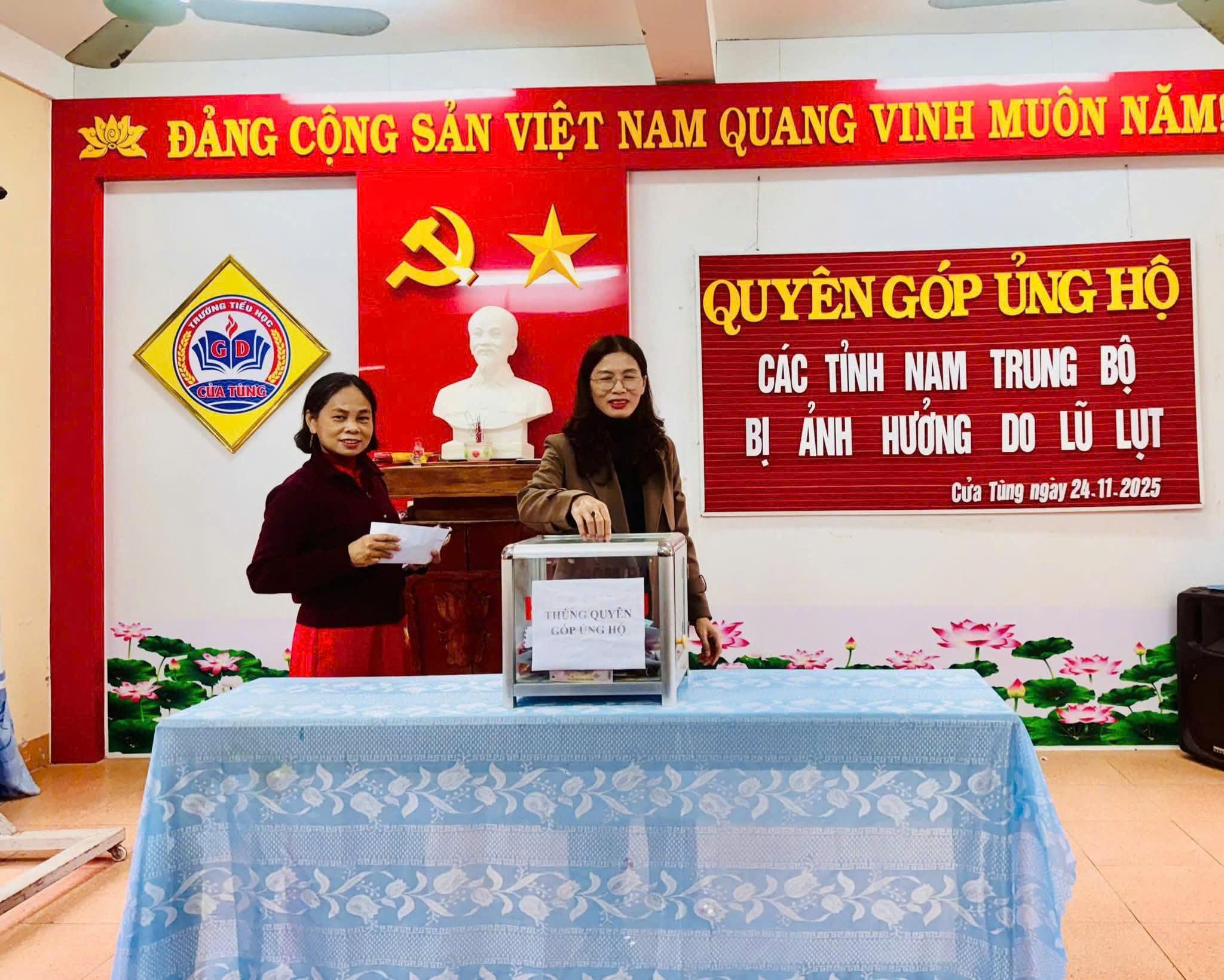 Sáng ngày 24/11/2025 trường Tiểu học Cửa Tùng đã tổ chức chương trình quyên góp ủng hộ đồng bào các tỉnh Nam Trung Bộ đang chịu nhiều thiệt hại nặng nề do mưa lũ kéo dài trong những ngày qua. Với tinh thần “Lá lành đùm lá rách – Tương thân tương ái”, buổi quyên góp đã nhận được sự hưởng ứng tích cực của cán bộ, giáo viên, nhân viên, phụ huynh và học sinh toàn trường. Những bàn tay nhỏ bé, những tấm lòng thơm thảo của các em học sinh đã góp phần lan tỏa thông điệp yêu thương, sẻ chia với đồng bào vùng lũ Trong không khí trang nghiêm và ấm áp nghĩa tình, từng lớp, từng chi đội lần lượt tiến lên thùng quyên góp để ủng hộ bằng tiền mặt. Những món quà tuy nhỏ nhưng chứa đựng tình cảm lớn lao, thể hiện tinh thần trách nhiệm của tuổi nhỏ Cửa Tùng đối với cộng đồng Cô giáo Hoàng Thị Kim Ngân- Hiệu trưởng nhà trường đại diện Ban giám hiệu nhà trường cho biết: “Hoạt động quyên góp hôm nay không chỉ mang ý nghĩa hỗ trợ đồng bào vùng lũ vượt qua khó khăn, mà còn là bài học sống động về lòng nhân ái và kỹ năng sống dành cho học sinh”